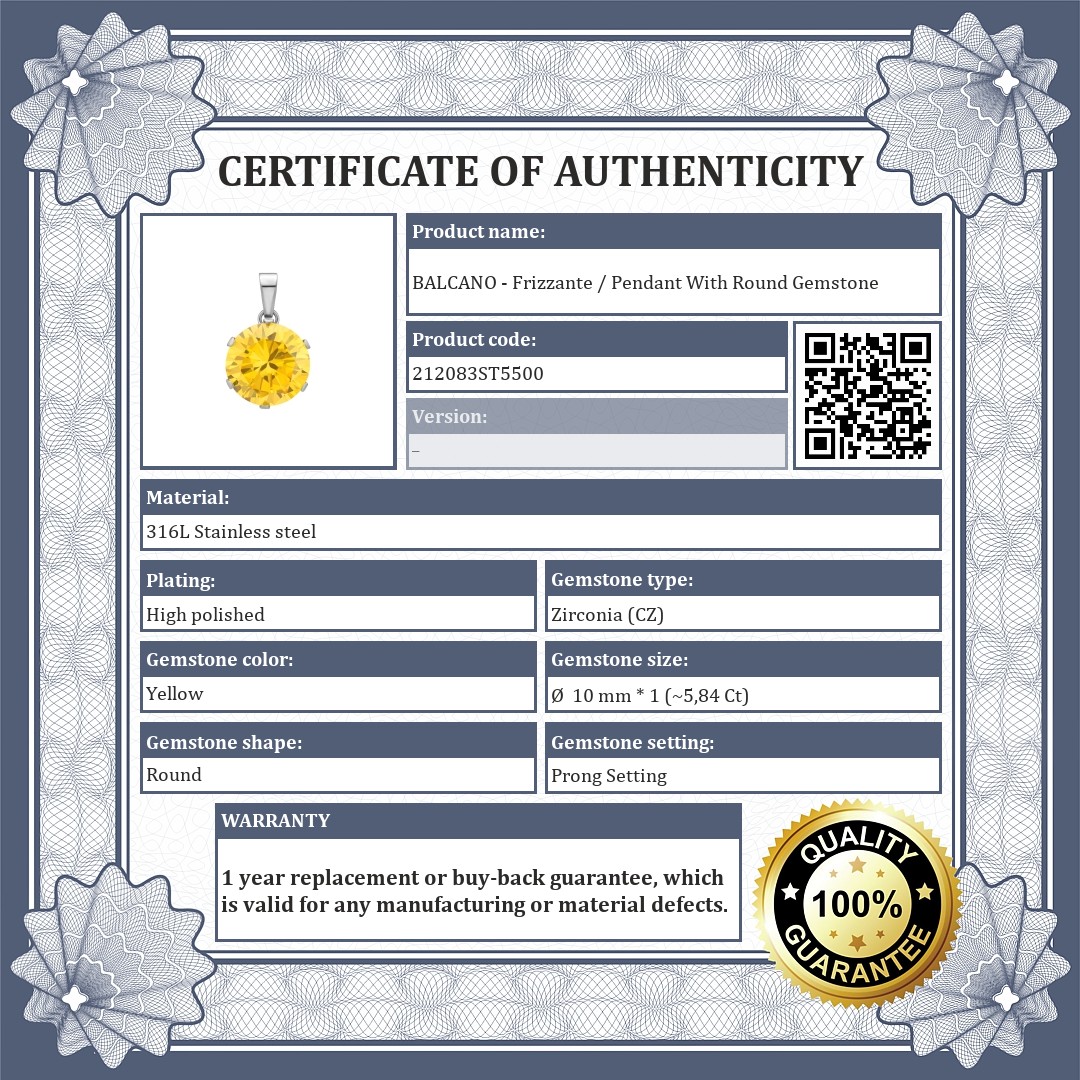 Golden yellow, round cubic zirconia pendant. 316L medical grade stainless steel jewelry, which will not weaer or discolour.