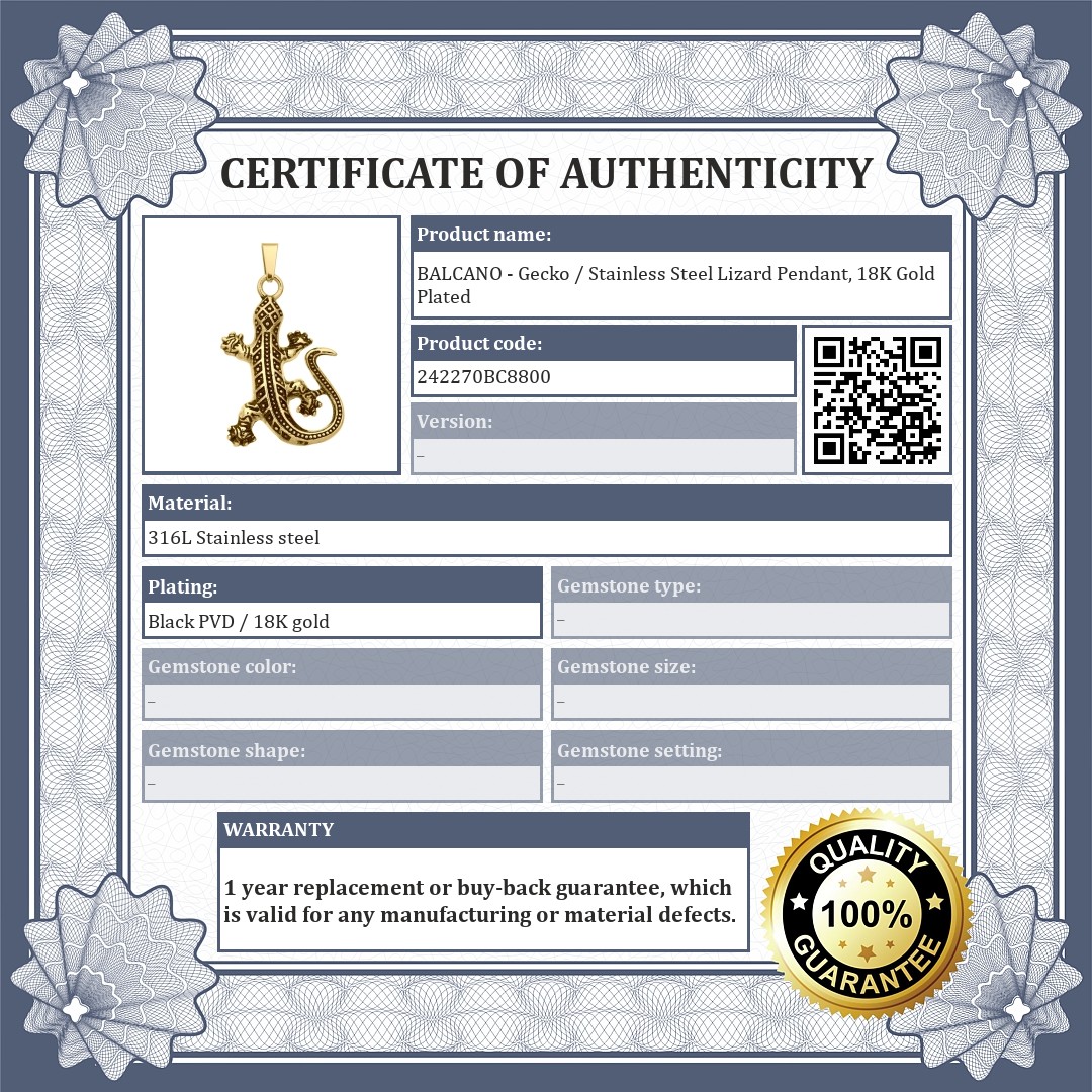 BALCANO - Gecko / Stainless Steel Lizard Pendant, 18K Gold Plated