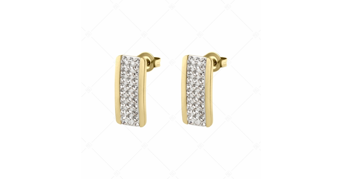 Special rectangular stud earrings, made even more elegant by the three rows of sparkling clear Czech crystals. High quality, 316L stainless steel jewelry with a shimmering 18K gold plated.