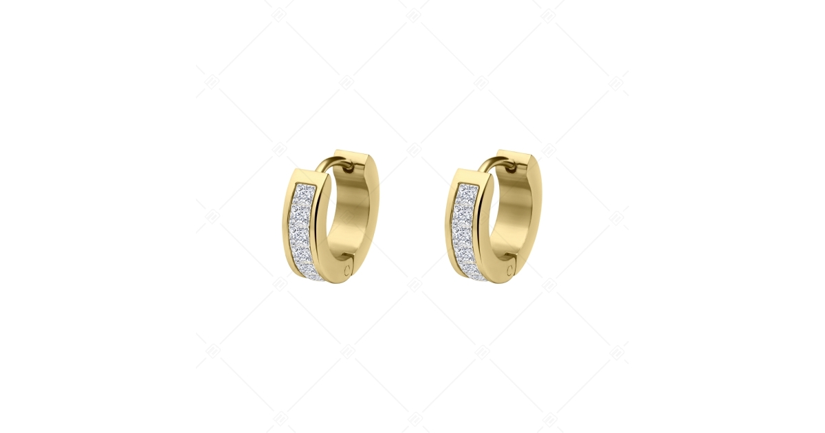 Elegant, hoop earring with sparkling, square shape cubic zirconia gemstones in a on the front. 18K gold plated anti-allergy 316L stainless steel jewelry. Thanks to its high quality material, it will not wear or discolour.