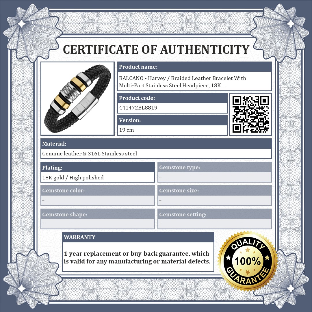 BALCANO - Harvey / Braided Leather Bracelet With Multi-Part Stainless Steel Headpiece, 18K Gold Plated