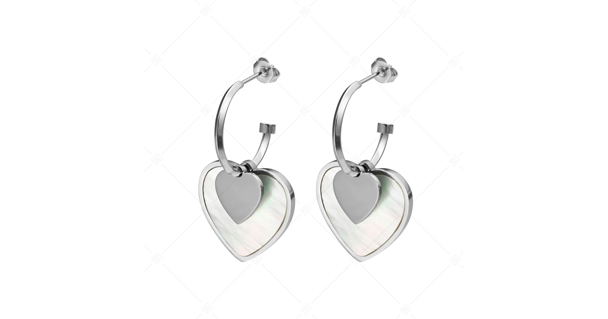 Trendy, 316L medical stainless steel earrings with high polish. Semi-circular earrings with friction post, decorated with two heart shapes, one with a smaller smooth surface and one with a larger mother of pearl-plated surface.