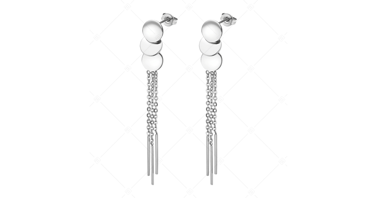 316L stainless steel dangle earrings with high polish. It is decorated with thin anchor chains from three small round plates. Allergy-free jewellery so anyone can wear it safely. Thanks to its material, it will not discolour or wear off and is not sensitive to medicinal water or cleaning products. A unique accessory for any occasion.