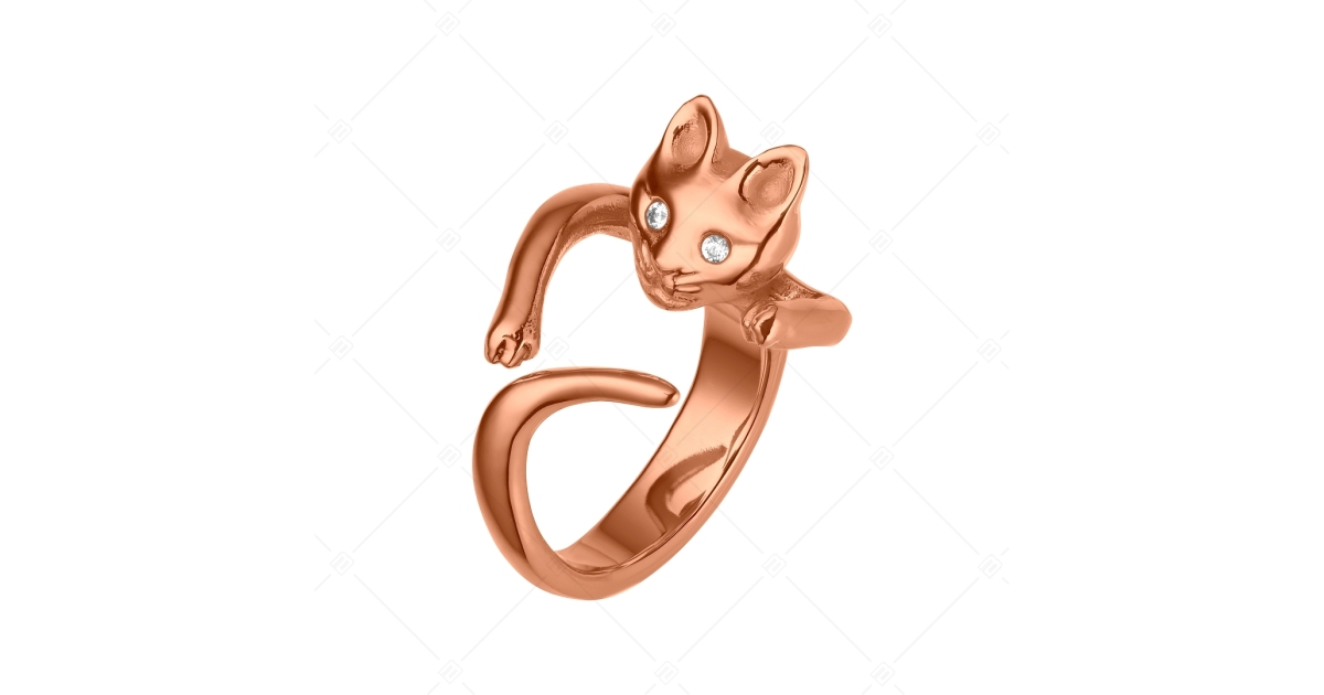 Cat shaped ring with two clear cubic zirconia gemstone eyes. When put on the finger, it looks like a kitten is hugging it. Anti-allergenic, 316L medical grade stainless steel jewelry, plated with 18K rose gold.