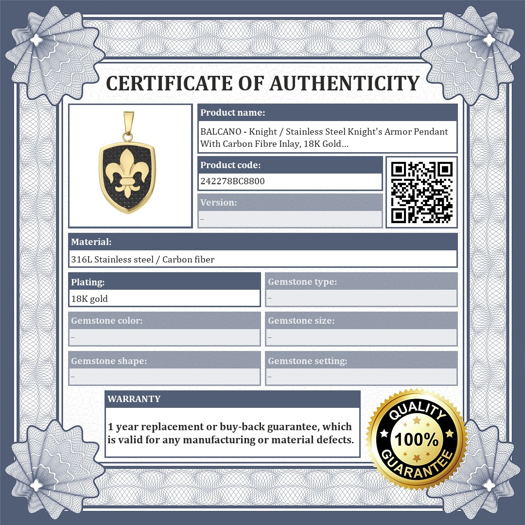 Knight's armour pendant with traditional lily design and carbon fibre inlaid decoration. Made of 316L medical stainless steel with 18K gold plated finish. A favourite of warrior at heart. The material is allergy-free, non-abrasive and non-fraying.