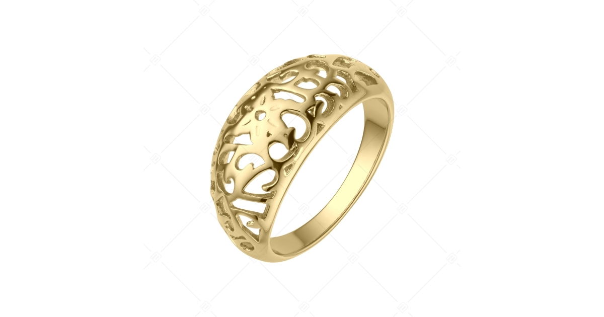 Anti-allergy, 316L stainless steel ring with beautiful 18K gold plated. The slightly curved headpiece is decorated with a non-figurative openwork pattern.