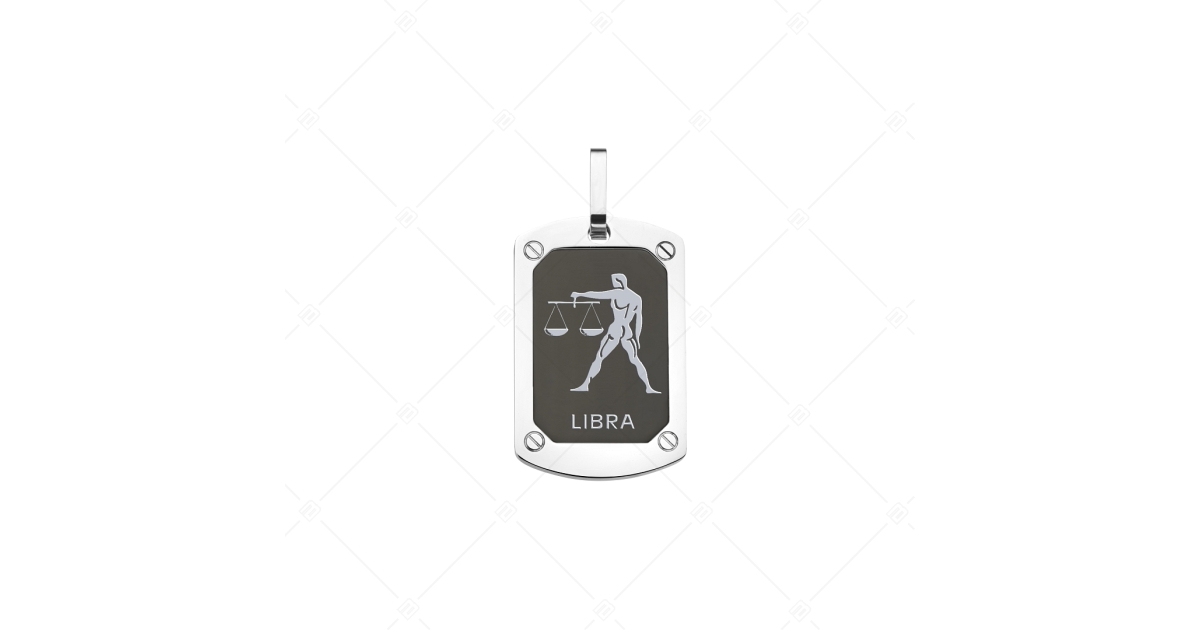 Horoscope pendant decorated with the image of the sign Libra. 316L medical stainless steel jewelry, which is extremely durable due to its material. In the centre is the symbol of the zodiac signs, engraved and painted. High polish and matt black PVD plated.