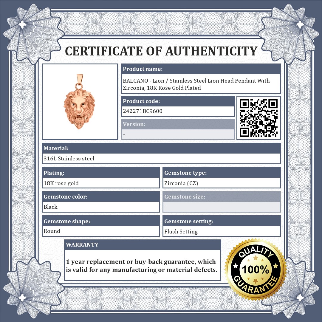 BALCANO - Lion / Stainless Steel Lion Head Pendant With Zirconia, 18K Rose Gold Plated