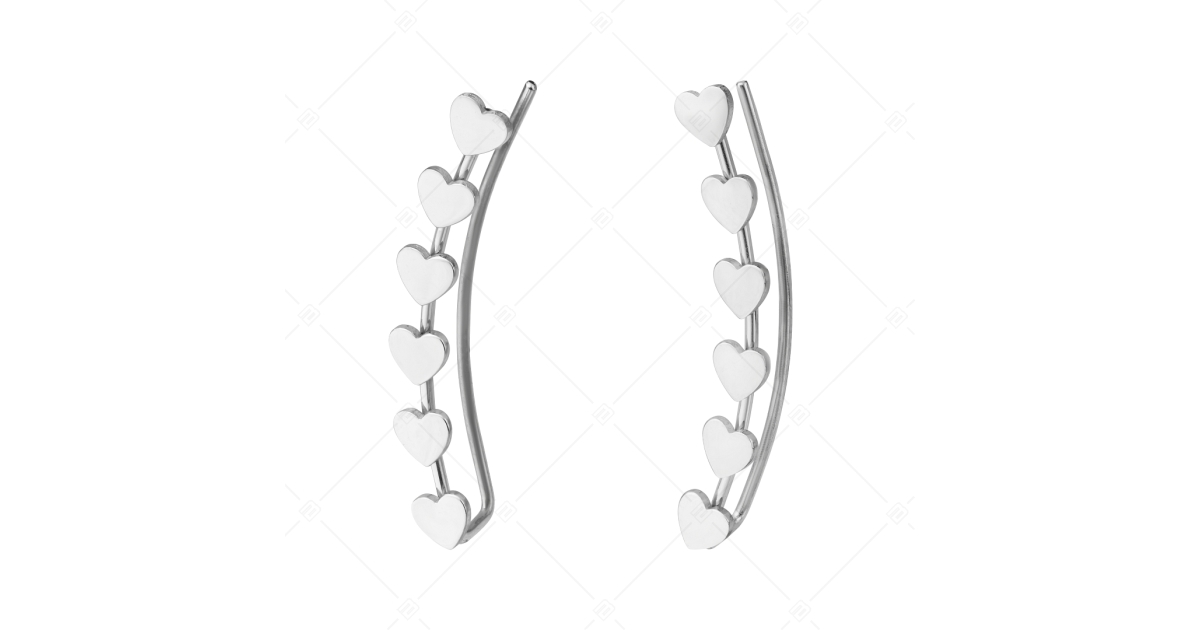 Fashionable earrings, that fit the curve of the ear, decorated with a row of small hearts. 316L medical grade, anti-allergy stainless steel accessory, with high polish.