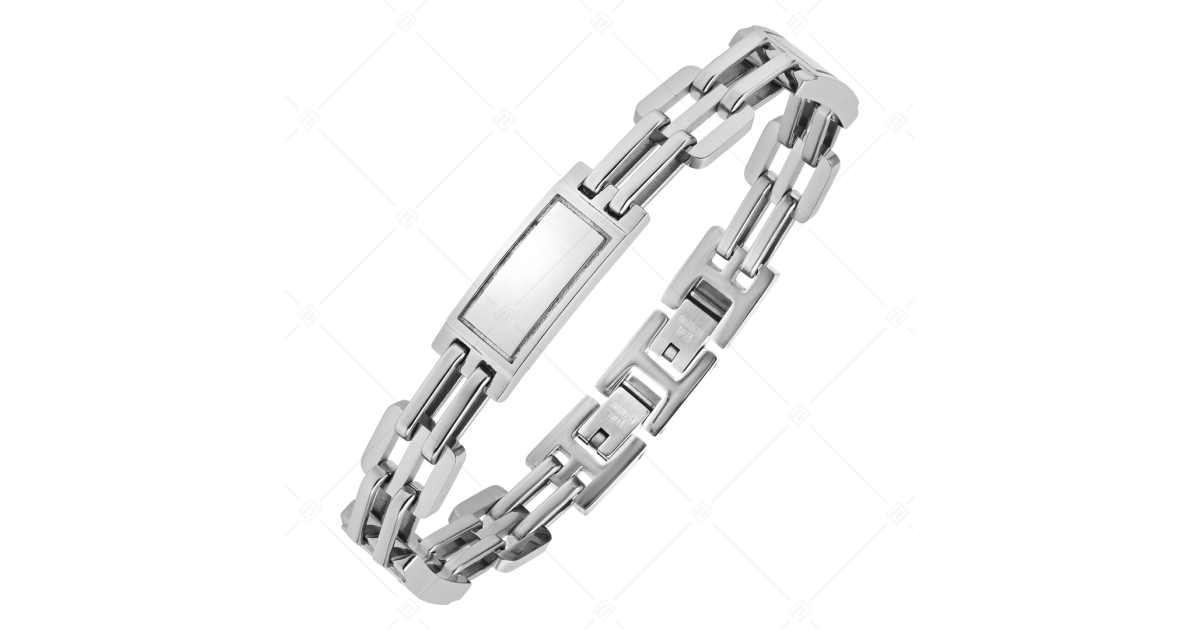 Between special links, it is decorated with a rectangular headpiece that can be engraved.
