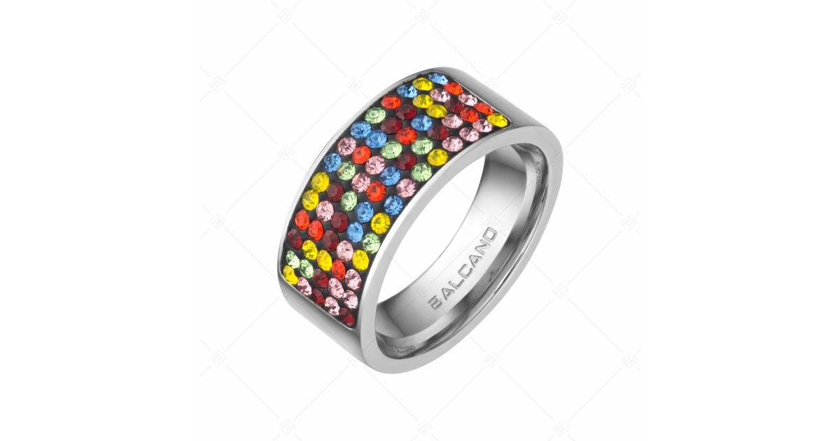 A bright ring with multicoloured Czech crystals. 316L medical grade stainless steel jewelry, which is extremely durable and will not wear or discolour.