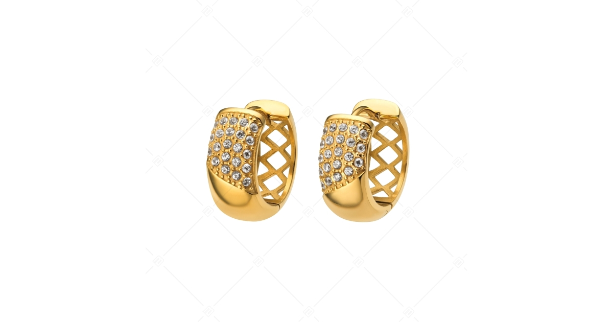 Huggie, hoop earrings, decorated with clear cubic zirconia gemstones. 316L medical grade stainless steel jewelry with 18K gold plated. Special design with crystals on the front and openwork pattern on the back.
