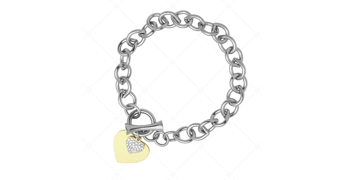 Fashionable round link chain bracelet with heart shaped charm. Anti-allergy, medical 316L stainless steel jewelry decorated with a two-piece heart. The smaller heart is set with sparkling clear Czech crystals, while the larger one has a smooth surface. The jewelry is finished with a high polished and 18K gold plated.