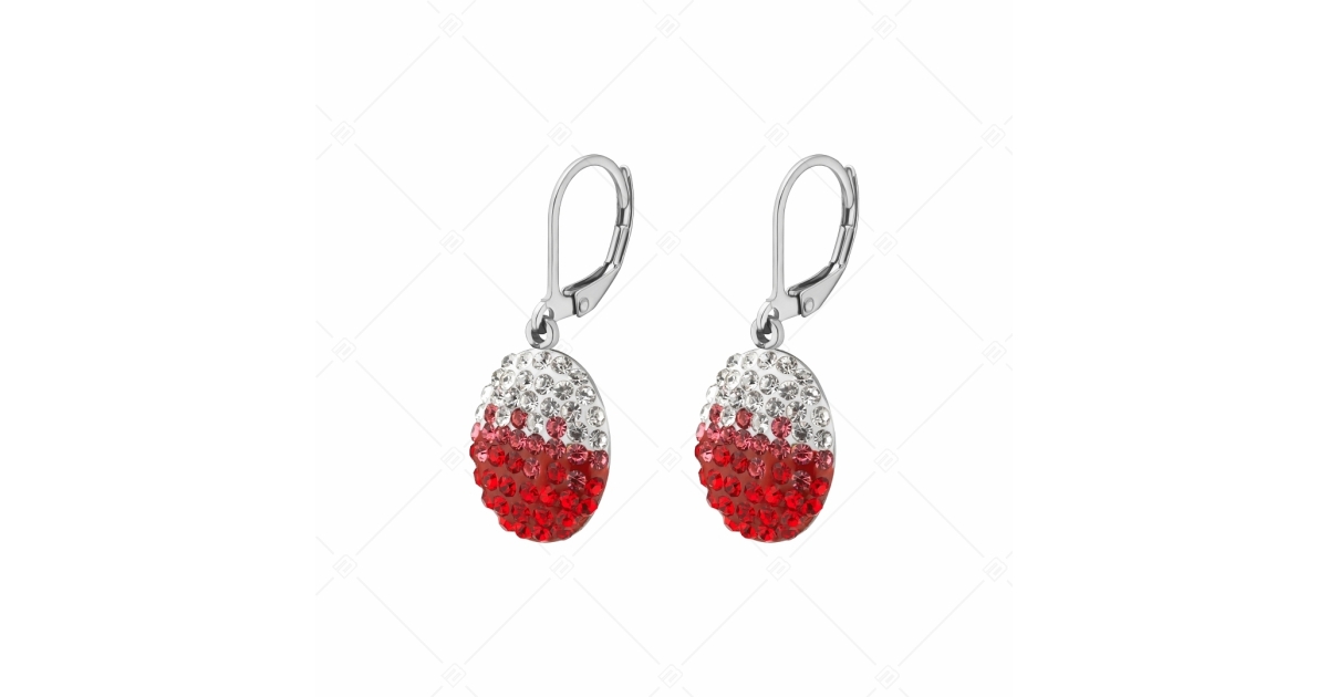 Oval shaped dangling earrings set with sparkling clear and red Czech crystals. 316L medical grade stainless steel jewelry, which is extremely durable and will not wear or discolour.