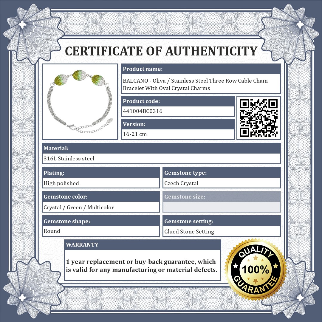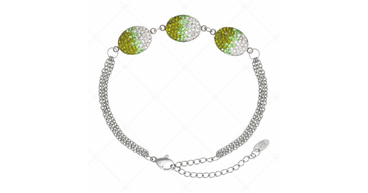 Oval charm bracelet set with clear and green Czech crystal. Three-row flattened cable chain bracelet made of 316L medical grade stainless steel. Thanks to its material, it is extremely durable and will not wear or discolour.