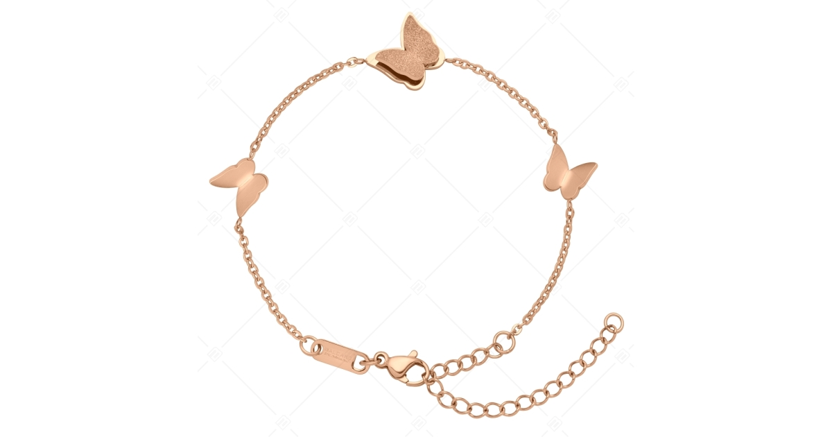 Decorative flattened cable chain decorated with three butterfly shapes. The top of the central double-winged butterfly has a special glitter surface that makes the jewelry even more beautiful. Made of 316L medical grade stainless steel and plated in 18K rose gold.