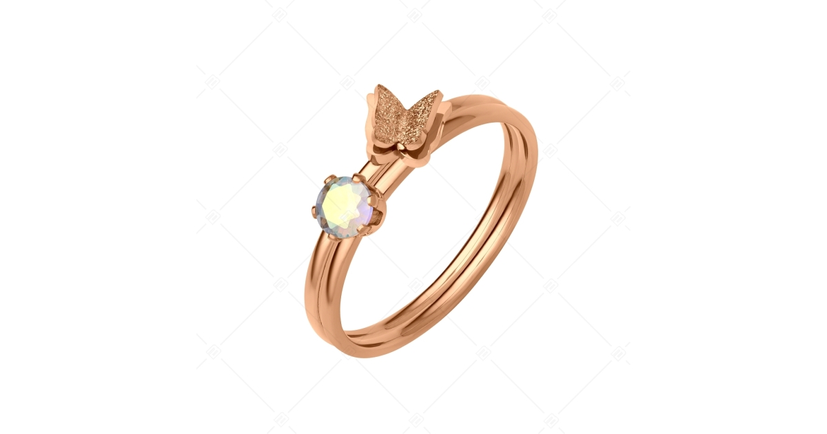 Decorative set of two rings. One ring is adorned with a double winged butterfly-shaped headpiece with a glitter surface, while the other is decorated with a beautiful, colour-playing cubic zirconia crystal. Anti-allergy, 316L stainless steel jewellery with a shimmering 18K rose gold plating.