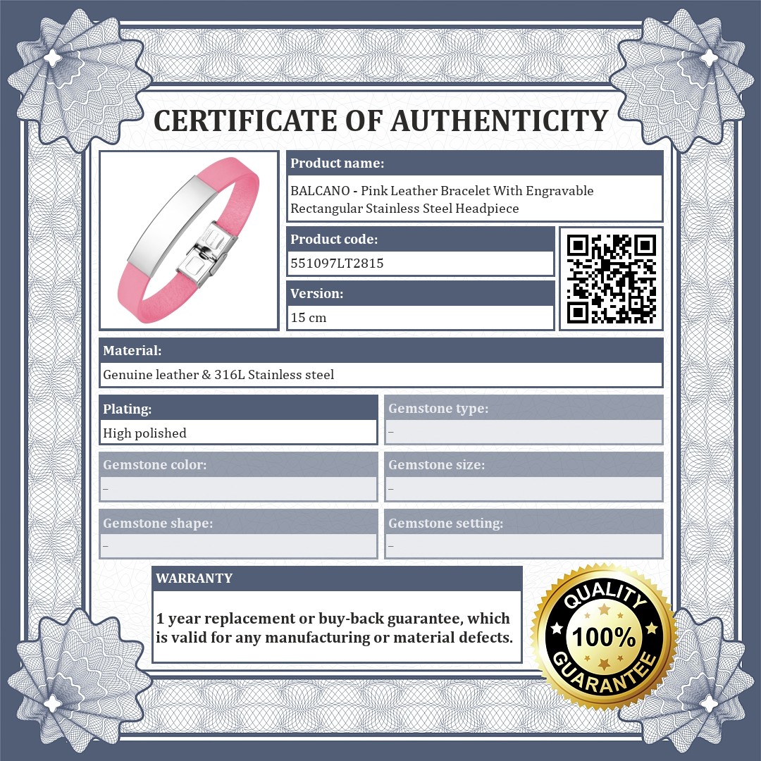 BALCANO - Pink Leather Bracelet With Engravable Rectangular Stainless Steel Headpiece
