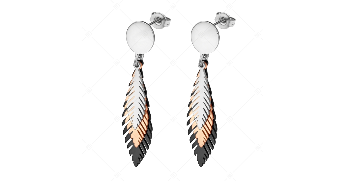 Three-piece 316L stainless steel dangling earrings in bird's feather shape with high polish, 18K rose gold plated and black PVD plated. Anti-allergy jewelry so anyone can wear it safely. Thanks to its material it will not discolour or wear out. Unique and special jewelry.