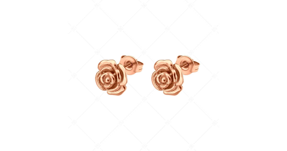 Rose shaped 316L stainless steel earrings with 18K rose gold plated. Anti-allergy jewellery so anyone can wear it safely. Thanks to its material, it will not discolour or wear off and is not sensitive to mineral water or detergents. A unique accessory for everyday wear.