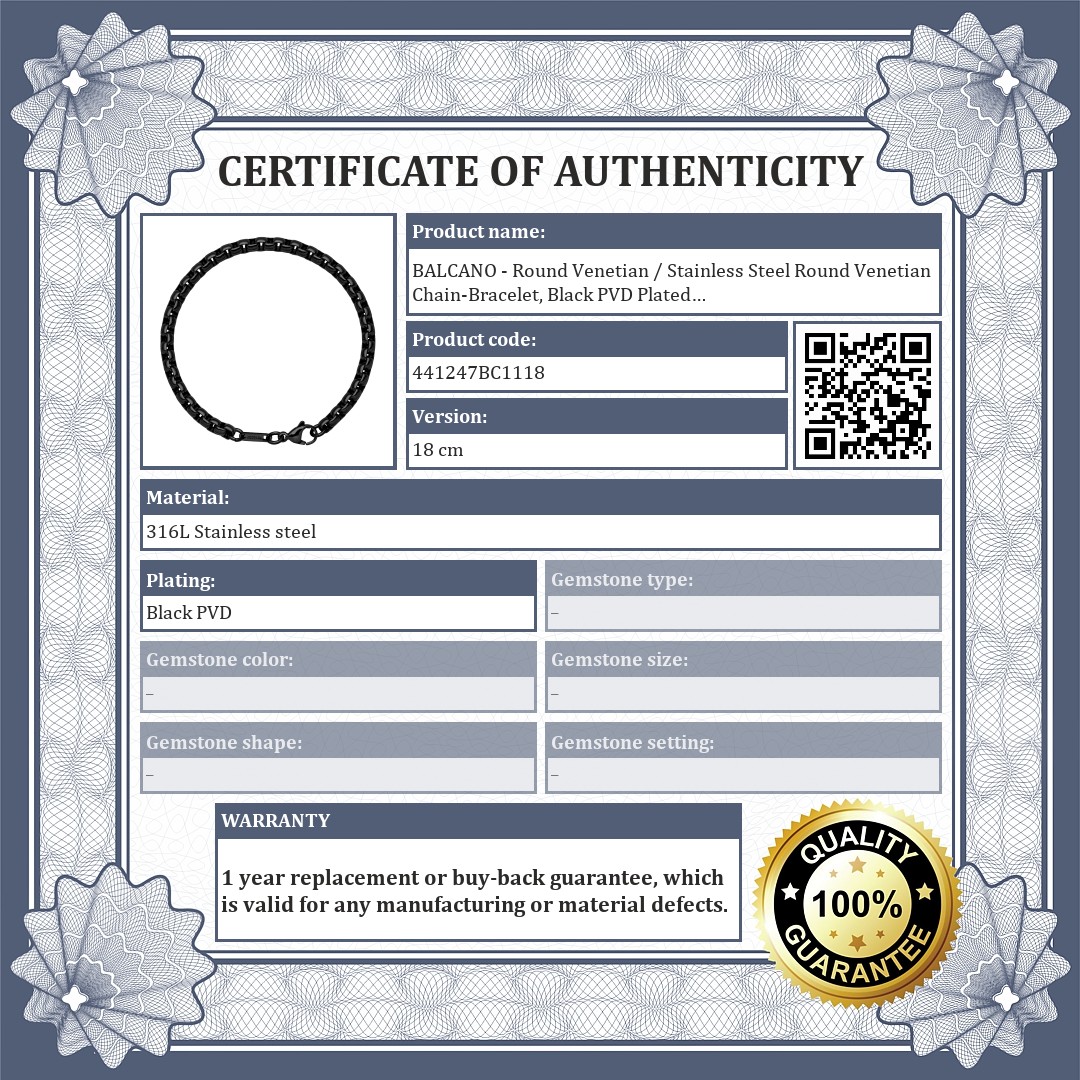 High quality, anti- allergy, medical 316L stainless steel, rounded Venetian chain bracelet with black PVD plated. Thanks to its material, it will not rust or tarnish with use.