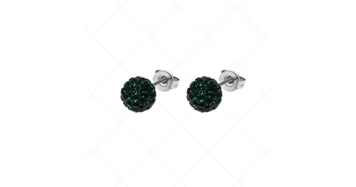 Fashionable stud earrings with dark green Czech crystals. 316L medical grade, anti-allergy stainless steel jewelry with high polish and secure friction post.