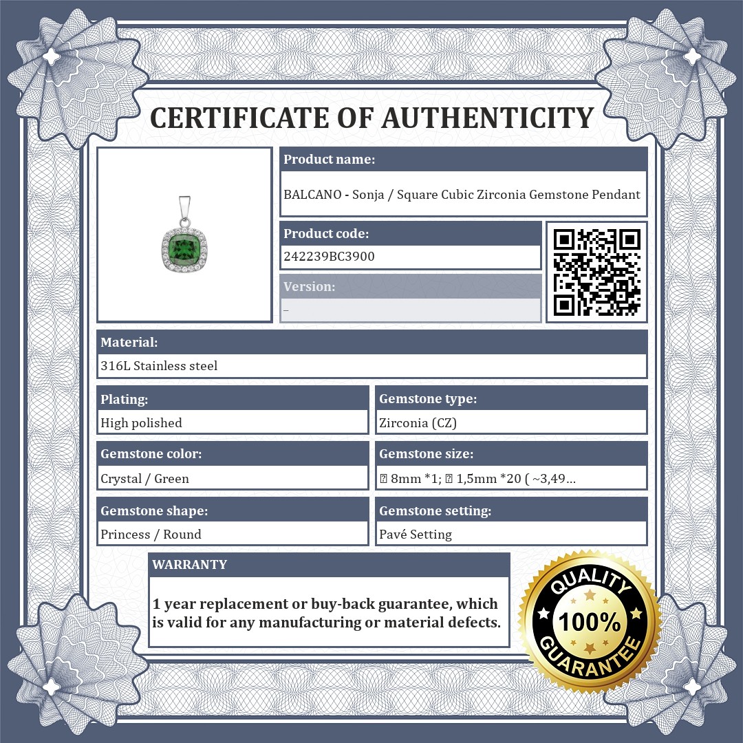 Elegant square pendant with cubic zirconia gemstones. Anti-allergy, 316L stainless steel with high polish. A larger square green stone in the centre is surrounded by a circle of shiny, clear, smaller round cubic zirconia stones, which make the jewelry even more sparkling.