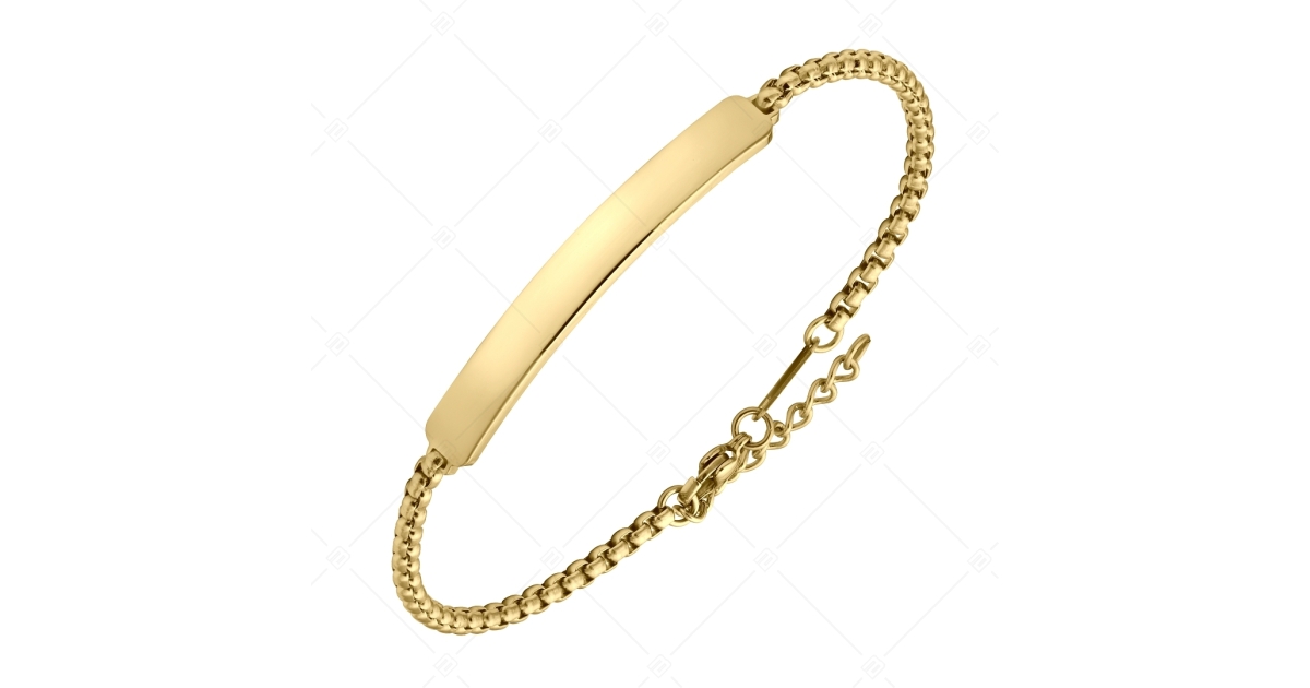 An impressive,rounded Venetian chain bracelet with an engravable rectangular headpiece. 316L medical grade stainless steel, anti-allergy, plated with 18K gold.
