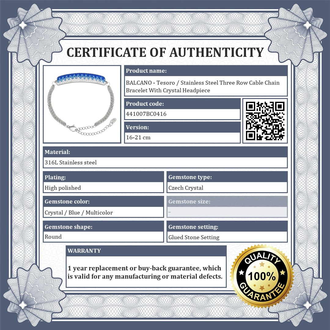Anti- allergy, 316L stainless steel, high polished jewelry. Adjustable size with lobster claw clasp bracelet made of three rows of flattened cable chains. Fashionable curved headpiece set with highly sparkling clear and blue Czech crystals.