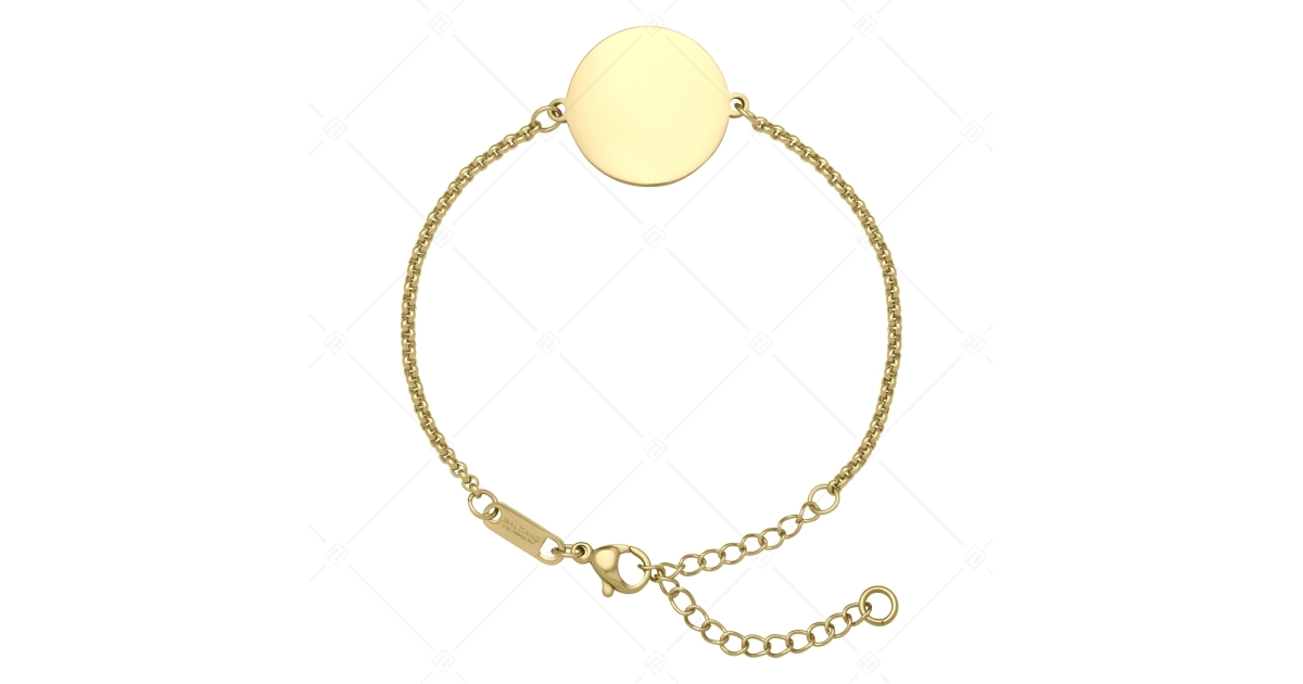 Fashionable, anti-allergy, 316L stainless steel belcher chain bracelet in adjustable size, with a gorgeous 18K gold plated. The round headpiece is suitable for engraving.