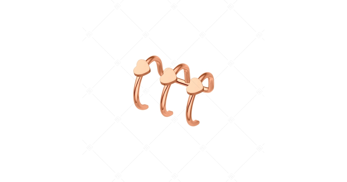 Ear cuff made of three-part cylindrical material with high polish and 18K rose gold plated. With three hearts pattern. Fashionable and comfortable wear at the same time. The material is hypoallergenic 316L medical stainless steel. It can be a stylish addition to an existing pair of earrings, but you can also choose additional matching jewelry from the huge selection of the BALCANO webshop. No ear holes are required.