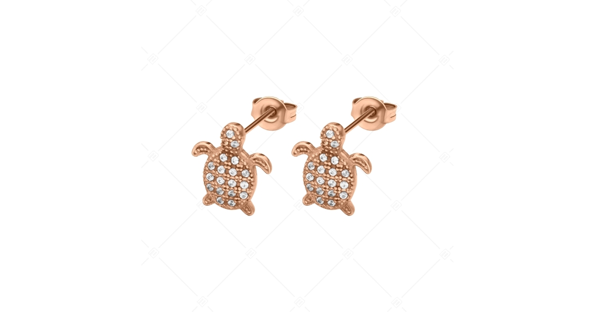 Turtle-shaped stud earrings with sparkling cubic zirconia gemstones. 316L medical anti- allergy, stainless steel jewelry, plated with 18K rose gold.