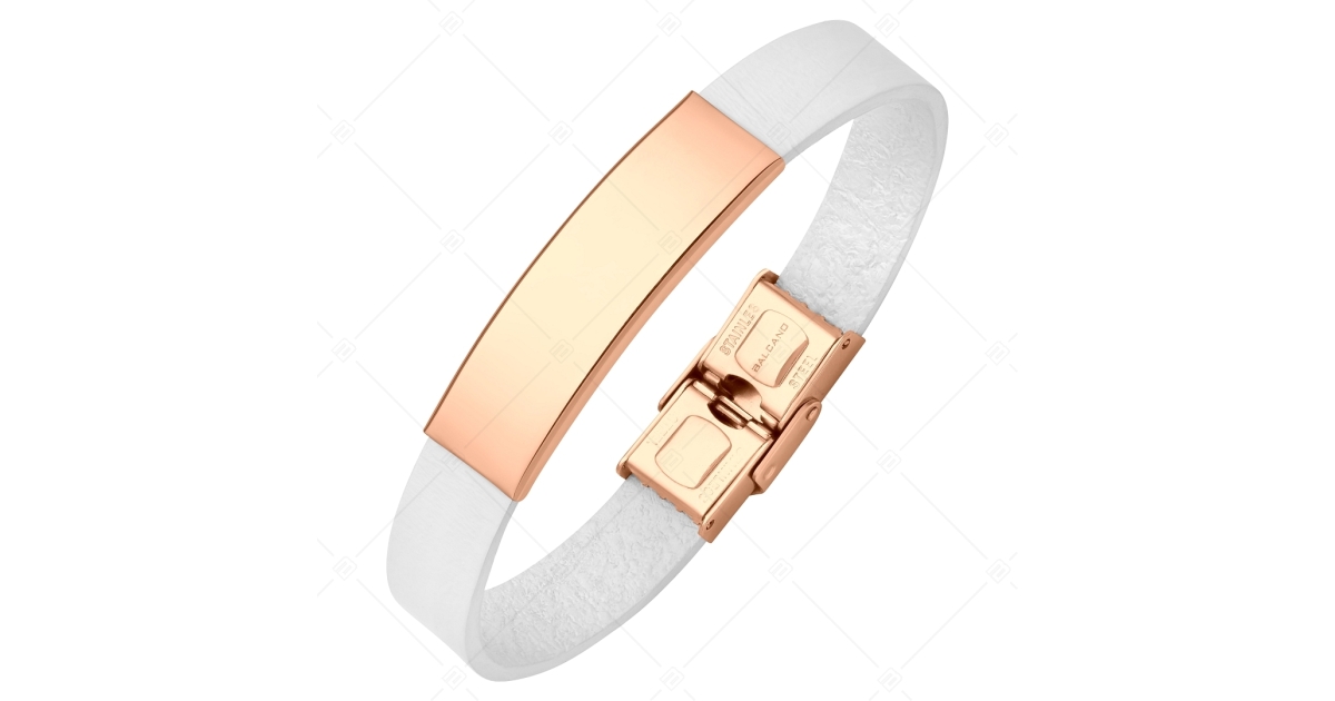 BALCANO - White Leather Bracelet With Engravable Rectangular 18K Rose Gold Plated Stainless Steel Headpiece