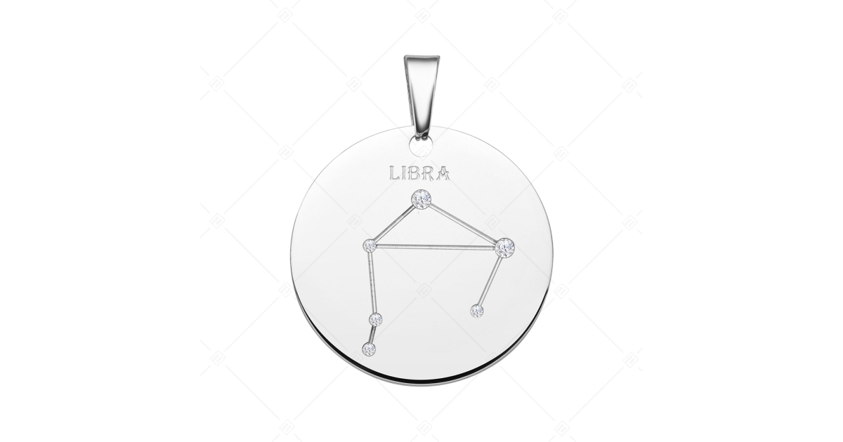 Pendant decorated with a Libra constellation. 316L medical grade stainless steel accessory with high polish. The constellation is engraved in a pattern of shimmering cubic zirconia stones, decorated with tiny bright little stars.