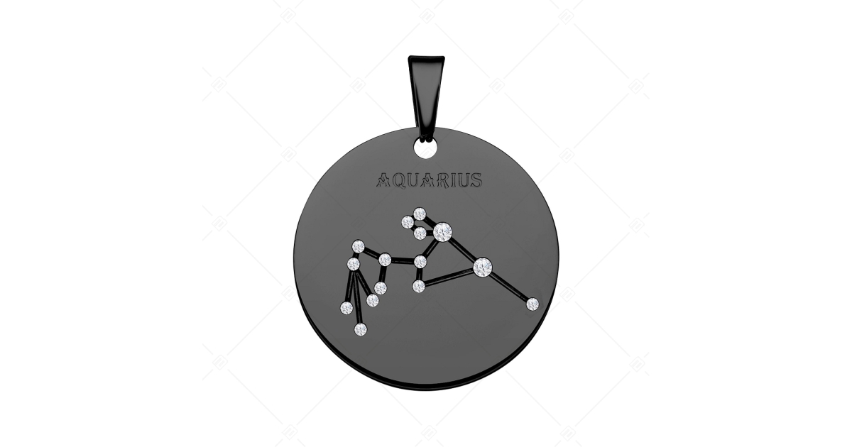 Pendant decorated with an Aquarius constellation. 316L medical grade stainless steel accessory with black, chrome PVD plated. The constellation motif is decorated with zirconia gemstones.