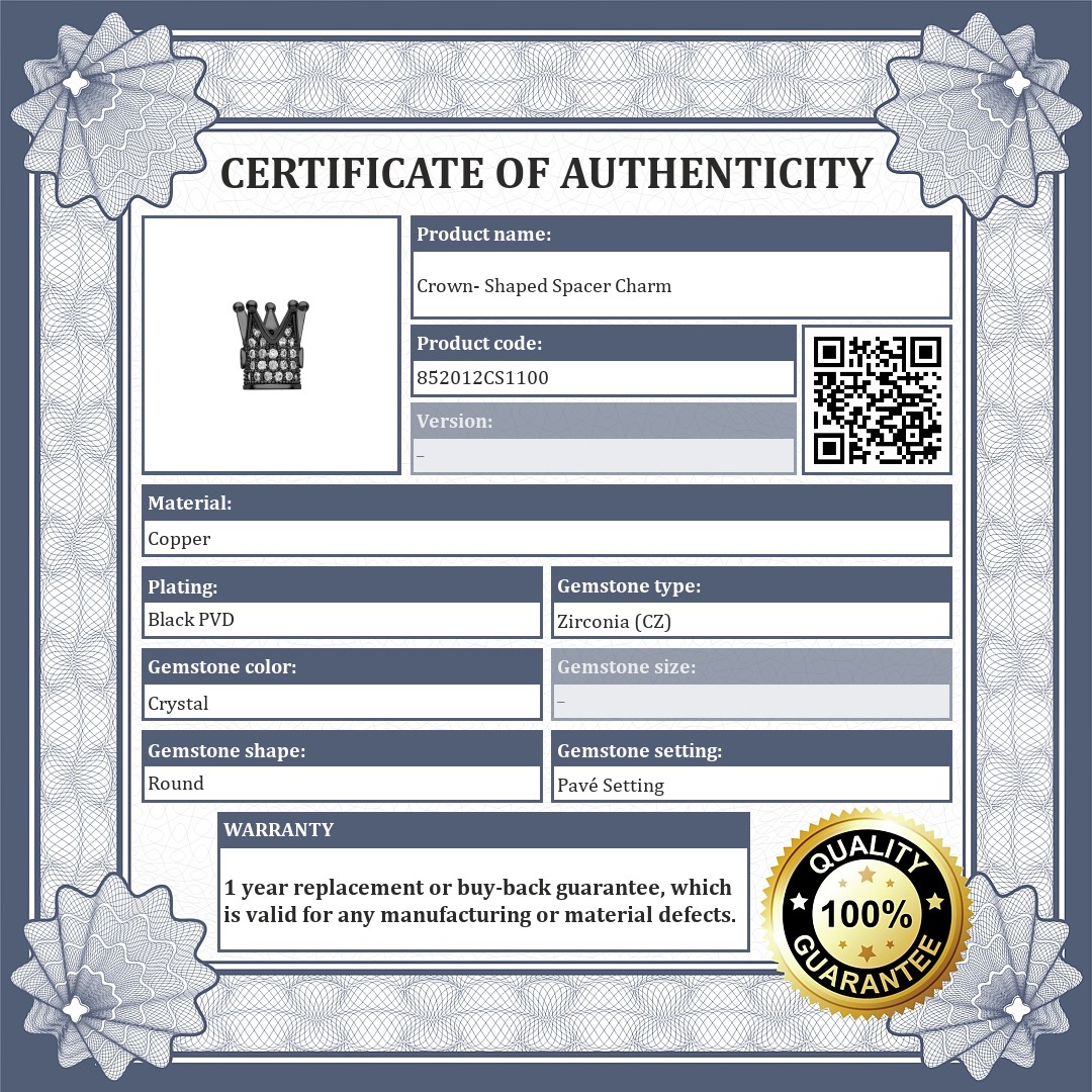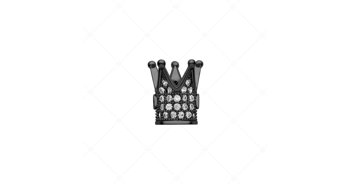 Crown- shaped copper spacer charm. It is encrusted with white cubic zirconia crystals in a black chrome PVD plated. The spacers ensure that your charms and beads don't slip on the bracelet.