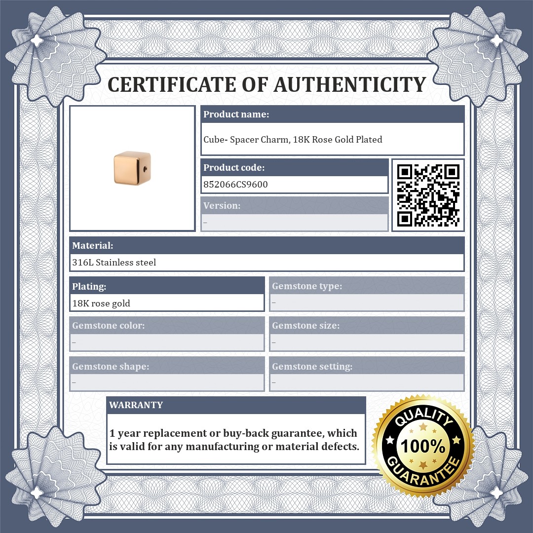 Cube- shaped spacer charm. Made of 316L medical grade stainless steel with 18K rose gold plated. The spacers ensure that the charms and beads do not slip off your bracelet.