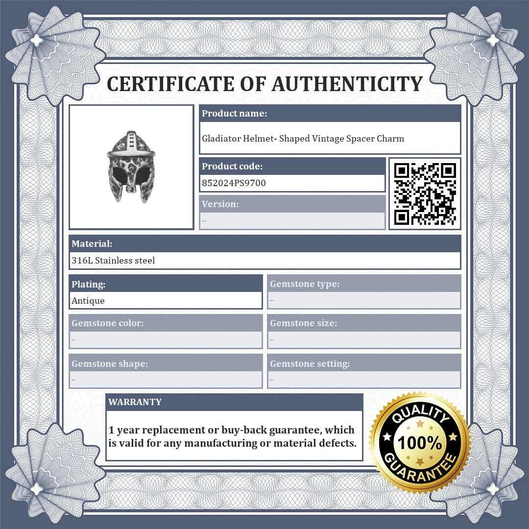 Gladiator helmet shaped spacer charm. Made from 316L medical grade stainless steel, the surface of this accessory has a special antiqued effect. Spacers ensure that charms and beads do not slip off your bracelet.