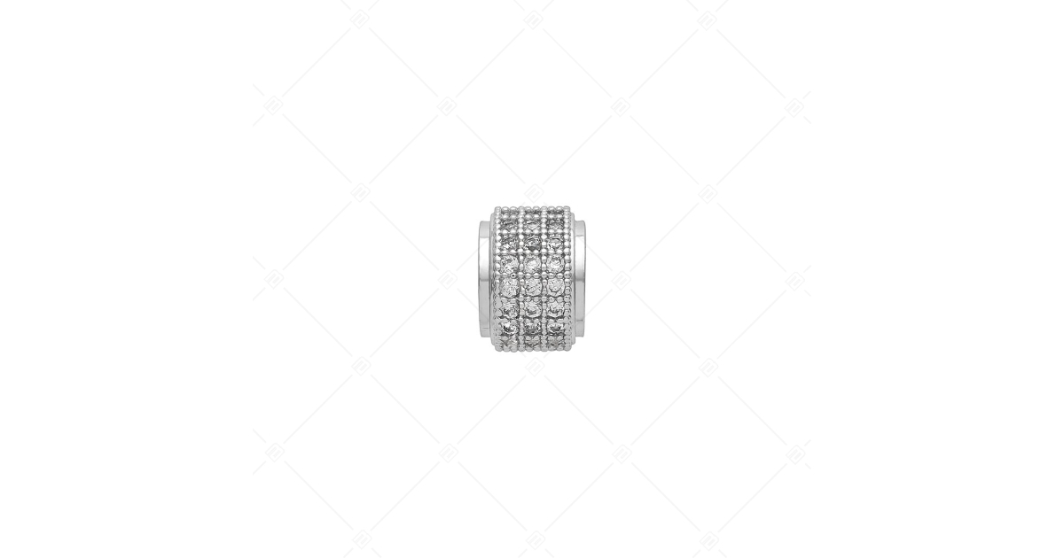 Thick round spacer charm, decorated with rows of cubic zirconia crystals in a circle. Made of copper with 925 Sterling silver plated accessory. The spacers ensure that your charms and beads will not slip on the bracelet.